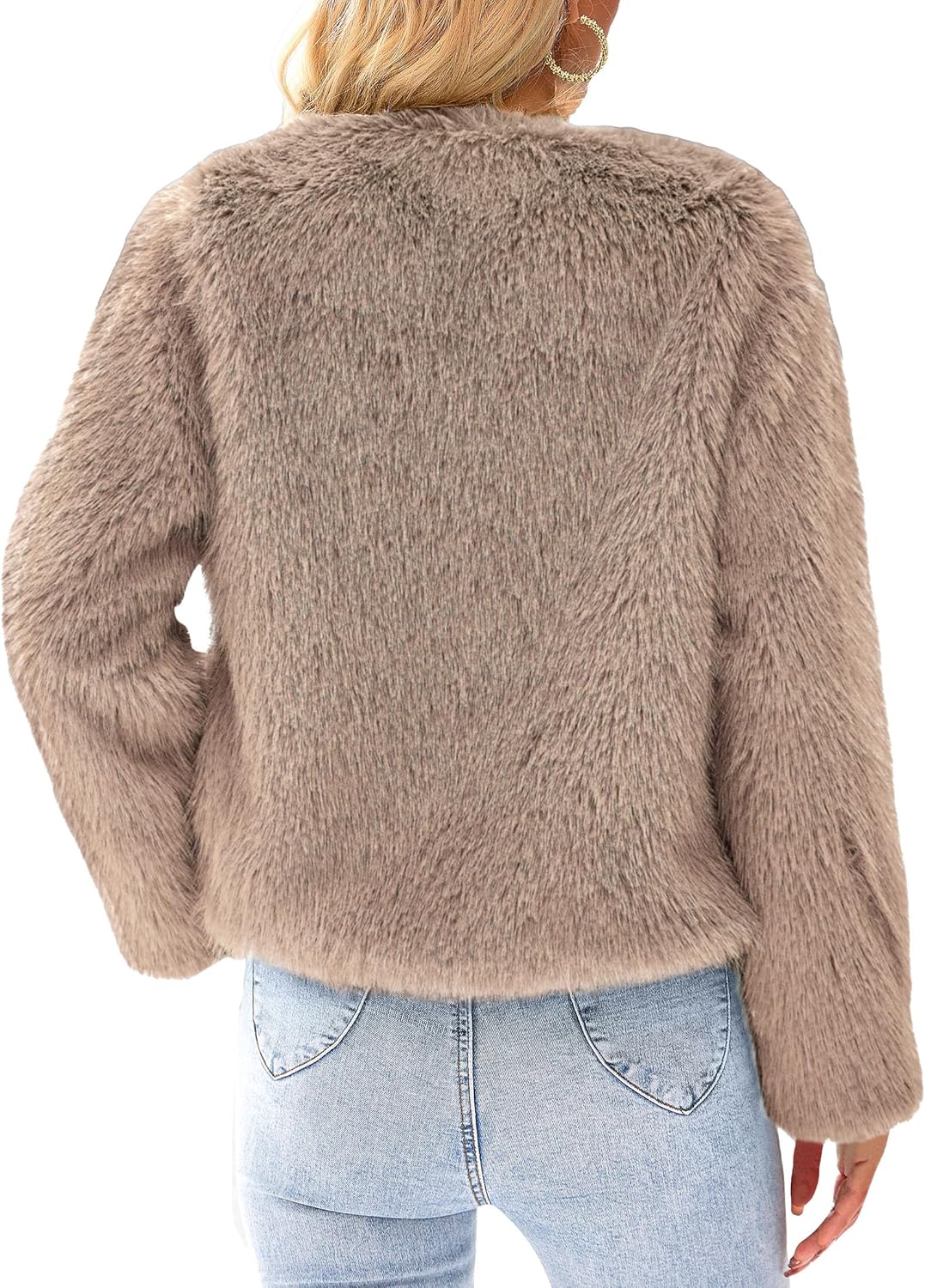 Women’s 2025 Winter Coats Fleece Cropped Jacket Faux Fur Long Sleeve Pockets Shaggy Warm Outerwear Fall Clothes